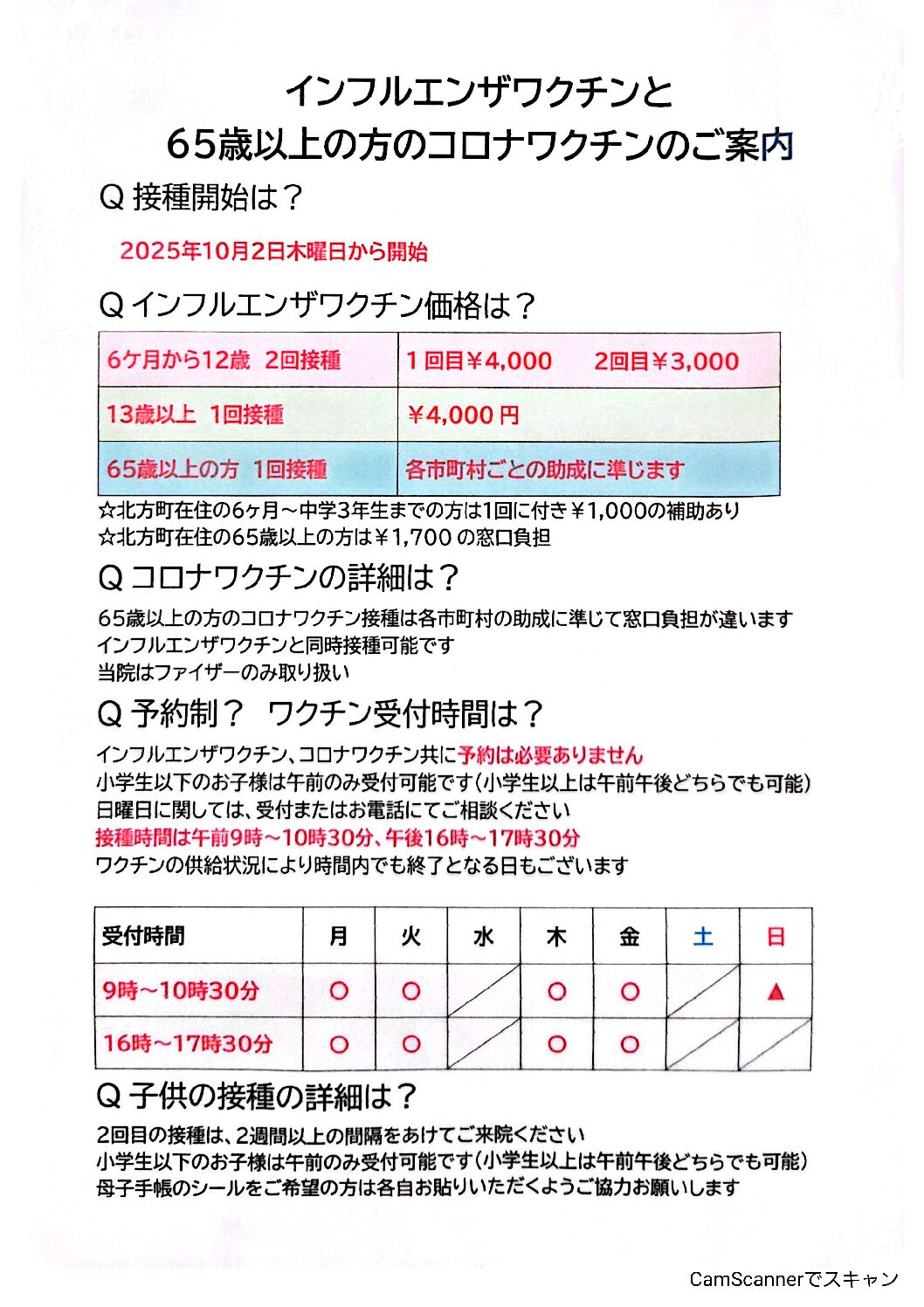 接種開始は? 2025年10月2日木曜日から開始 Q インフルエンザワクチン価格は? 6ヶ月から12歳 2回接種 1回目¥4,000 2回目 ¥3,000 13歲以上 1回接種 ¥4,000円 65歳以上の方 1回接種 ‥
