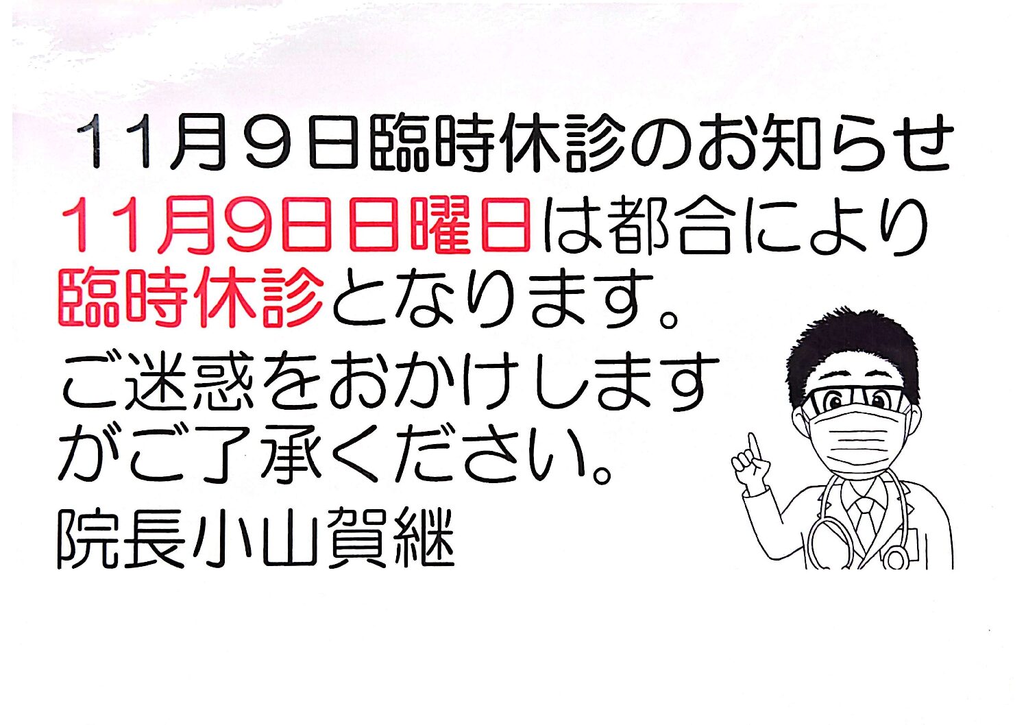 11月9日 日曜日 臨時休診のお知らせ